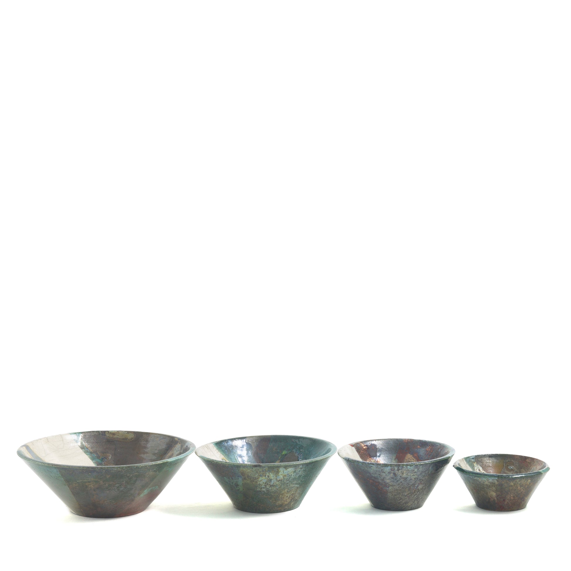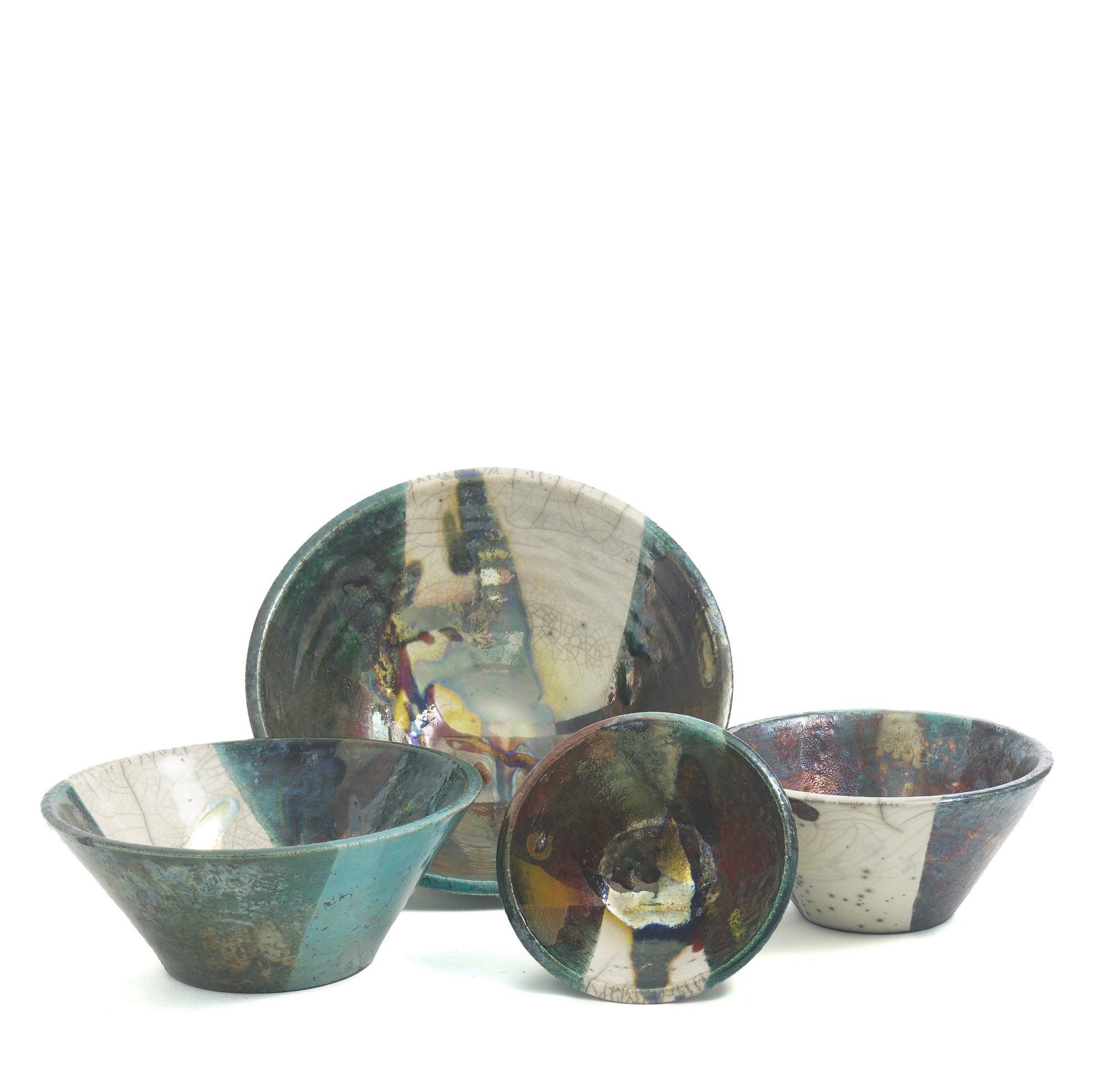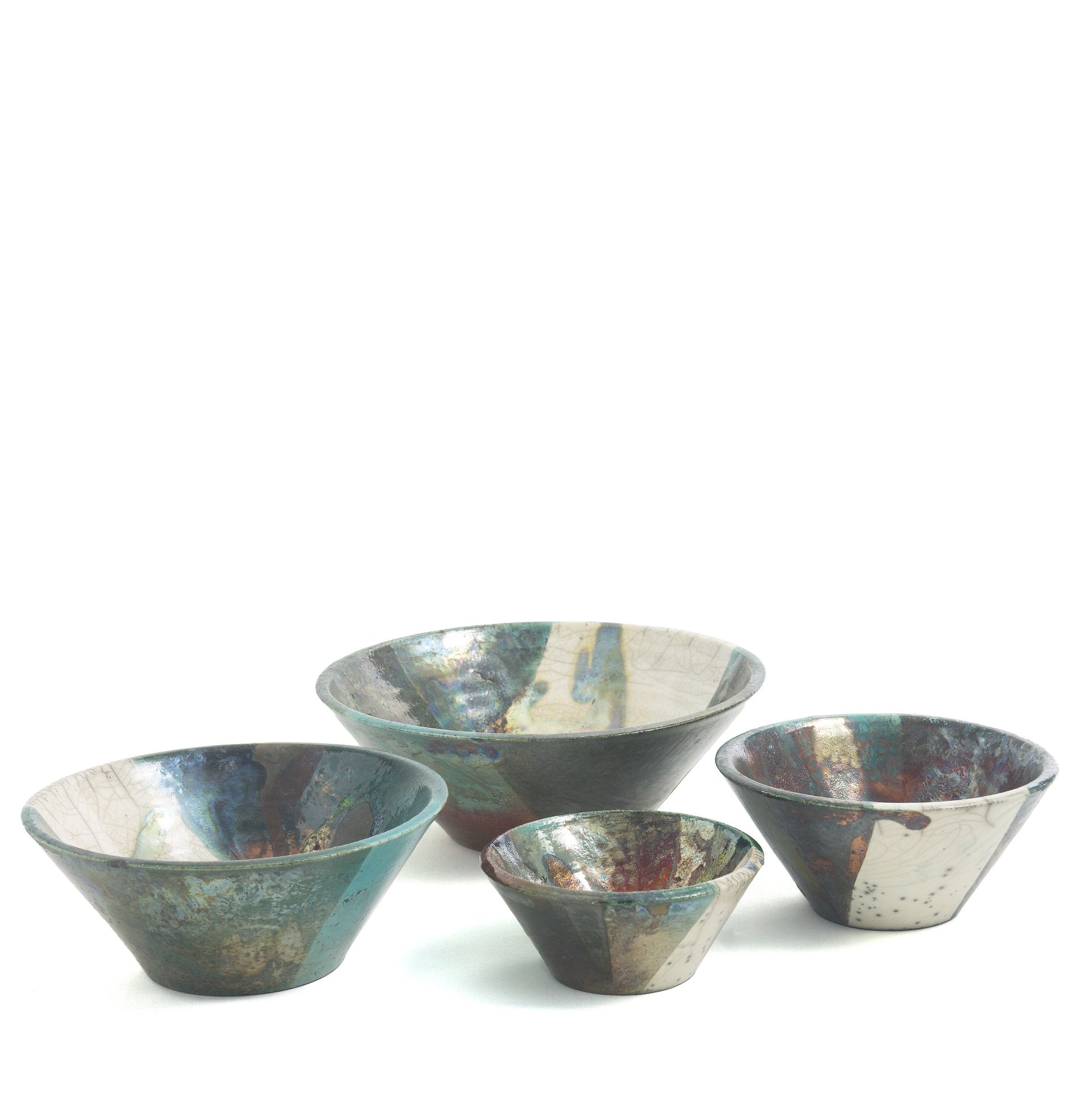 This superb set of four bowls actualizes a refined synthesis between abstract art and impeccable craftsmanship, resulting in a functional design that is sure to impress whatever the use. Handcrafted following the ancient Japanese Raku method, they boast an array of overlapping polychrome metallic finishes, which are further accented with coppery details.