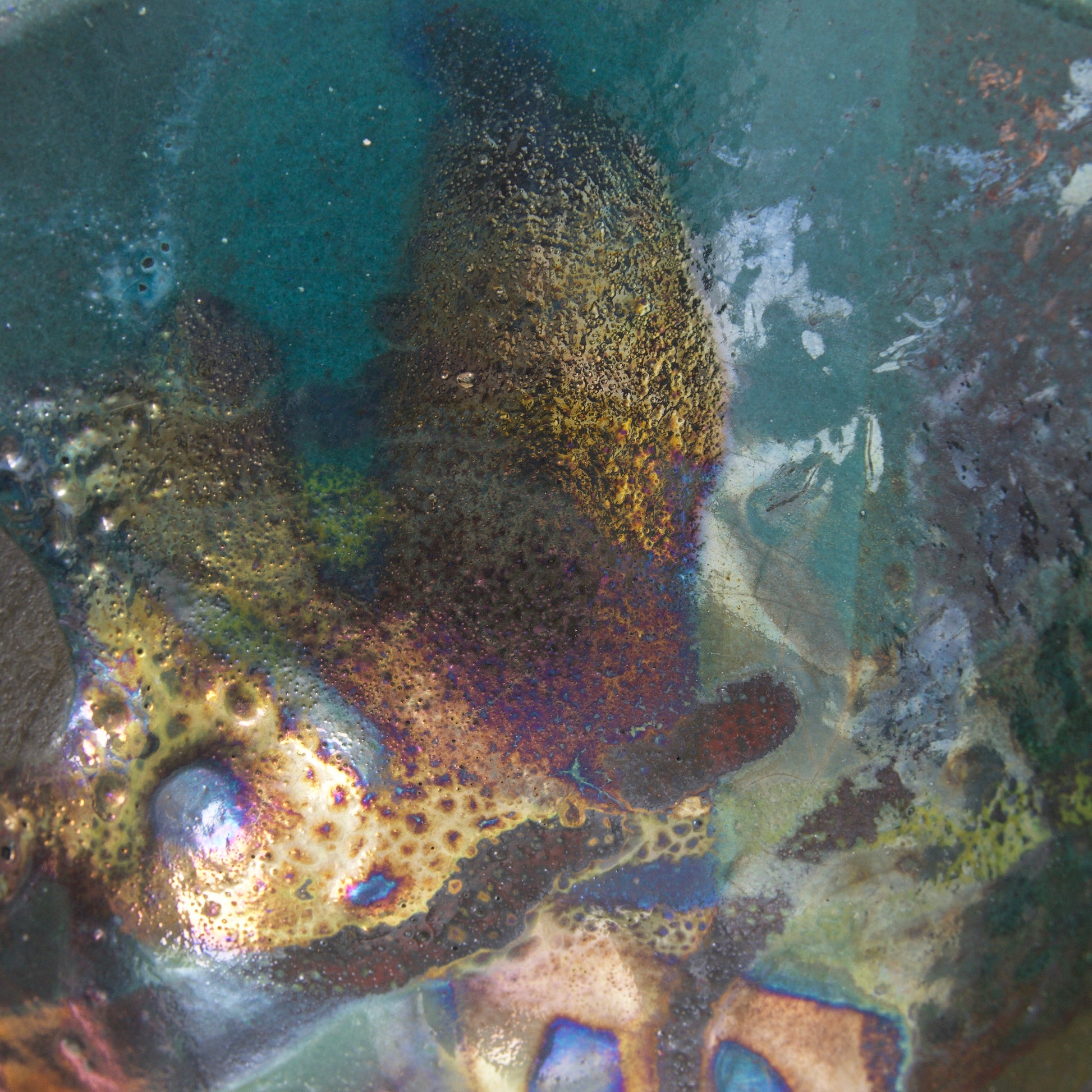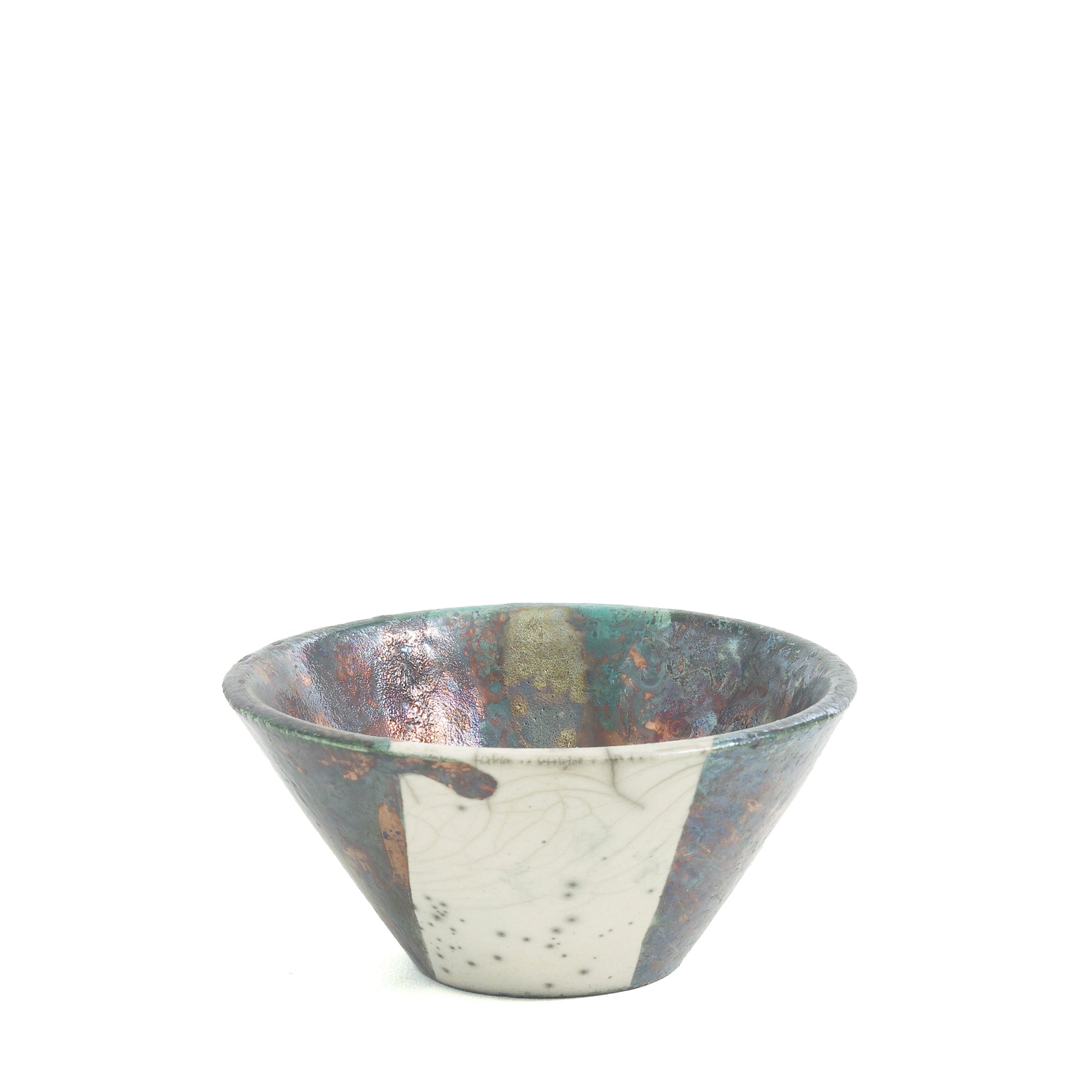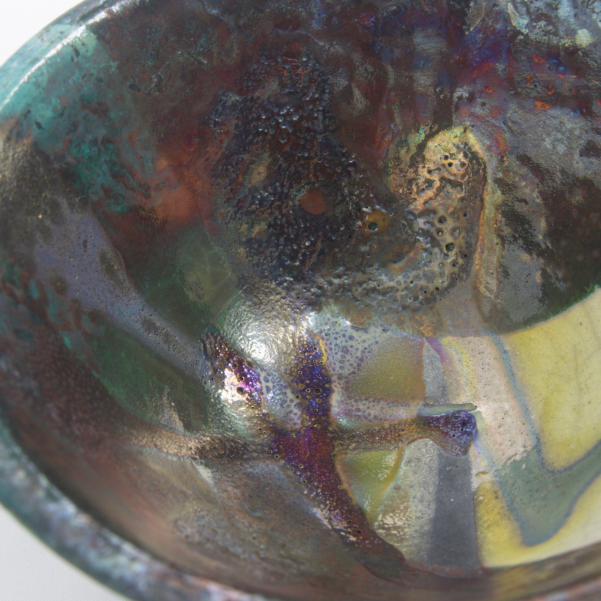 This superb set of four bowls actualizes a refined synthesis between abstract art and impeccable craftsmanship, resulting in a functional design that is sure to impress whatever the use. Handcrafted following the ancient Japanese Raku method, they boast an array of overlapping polychrome metallic finishes, which are further accented with coppery details.