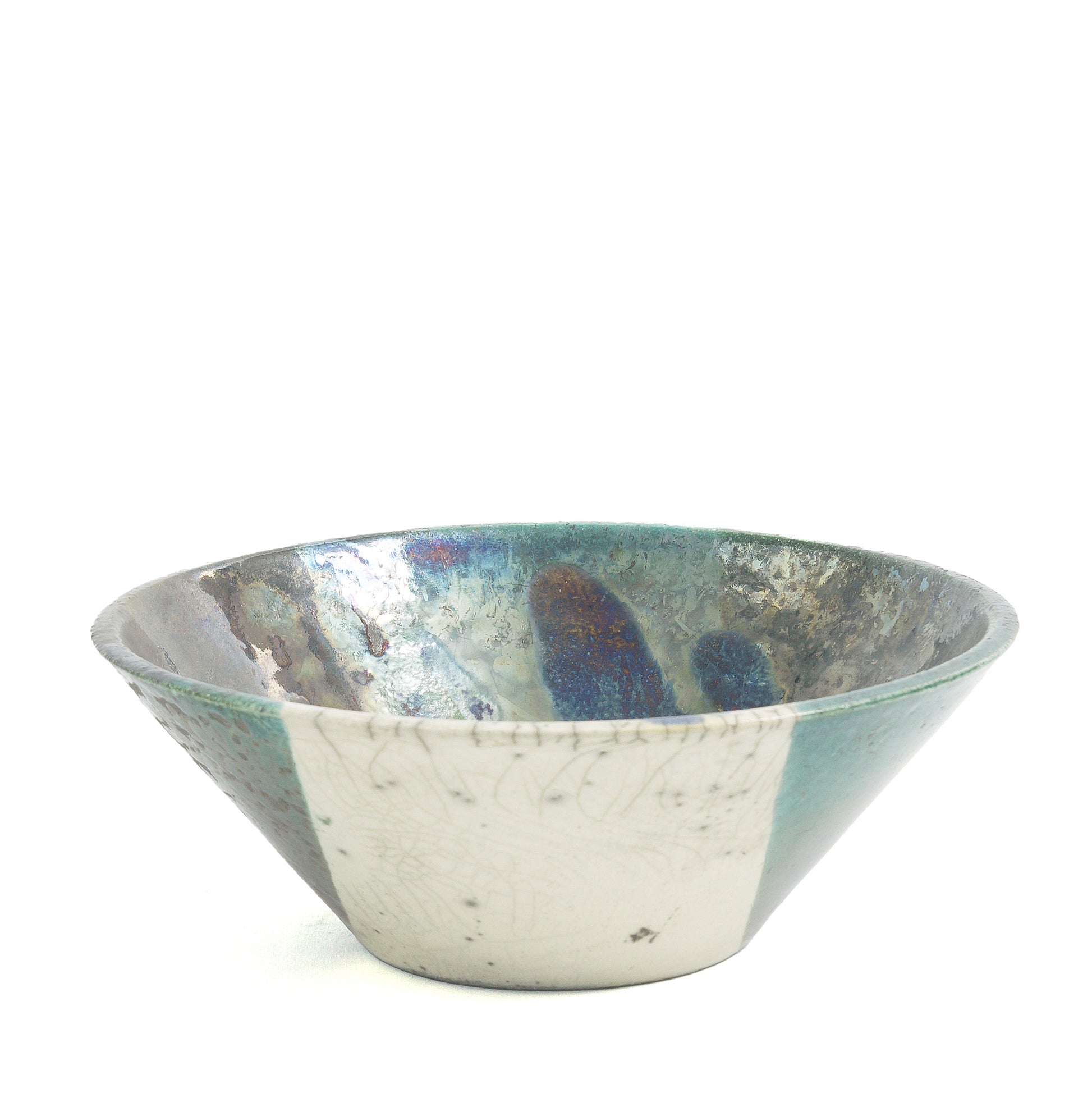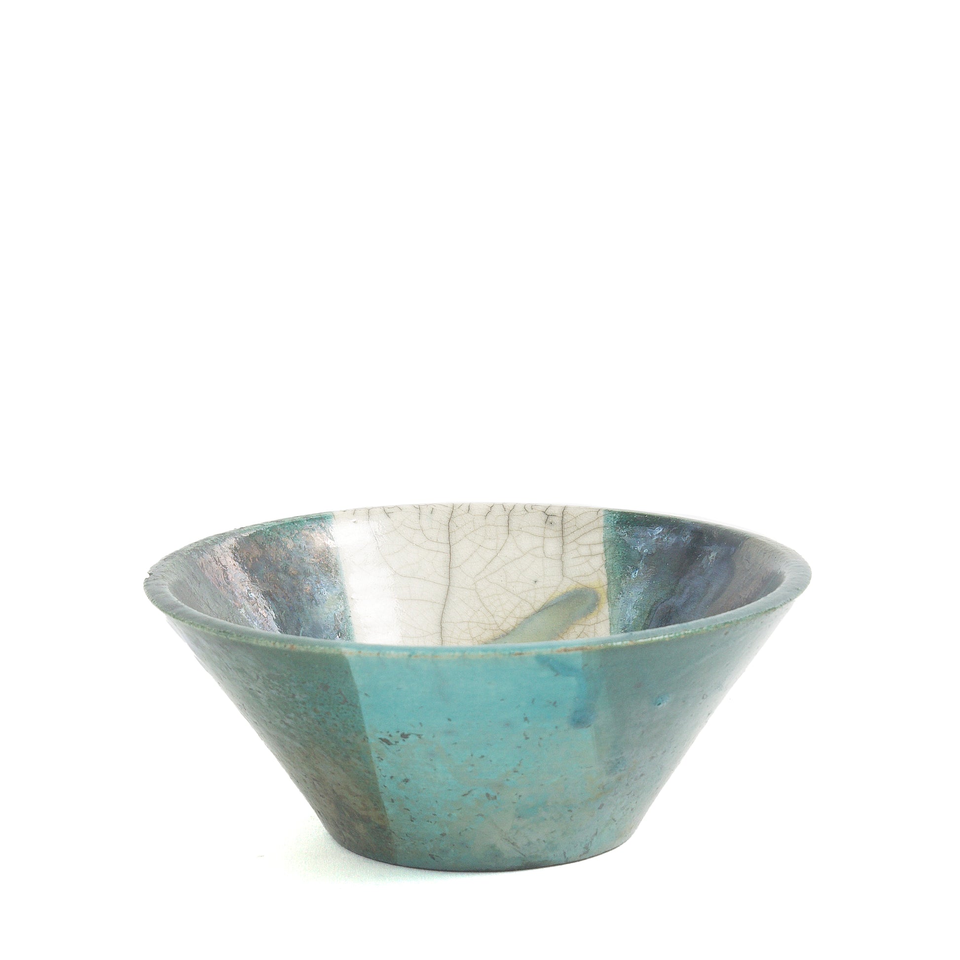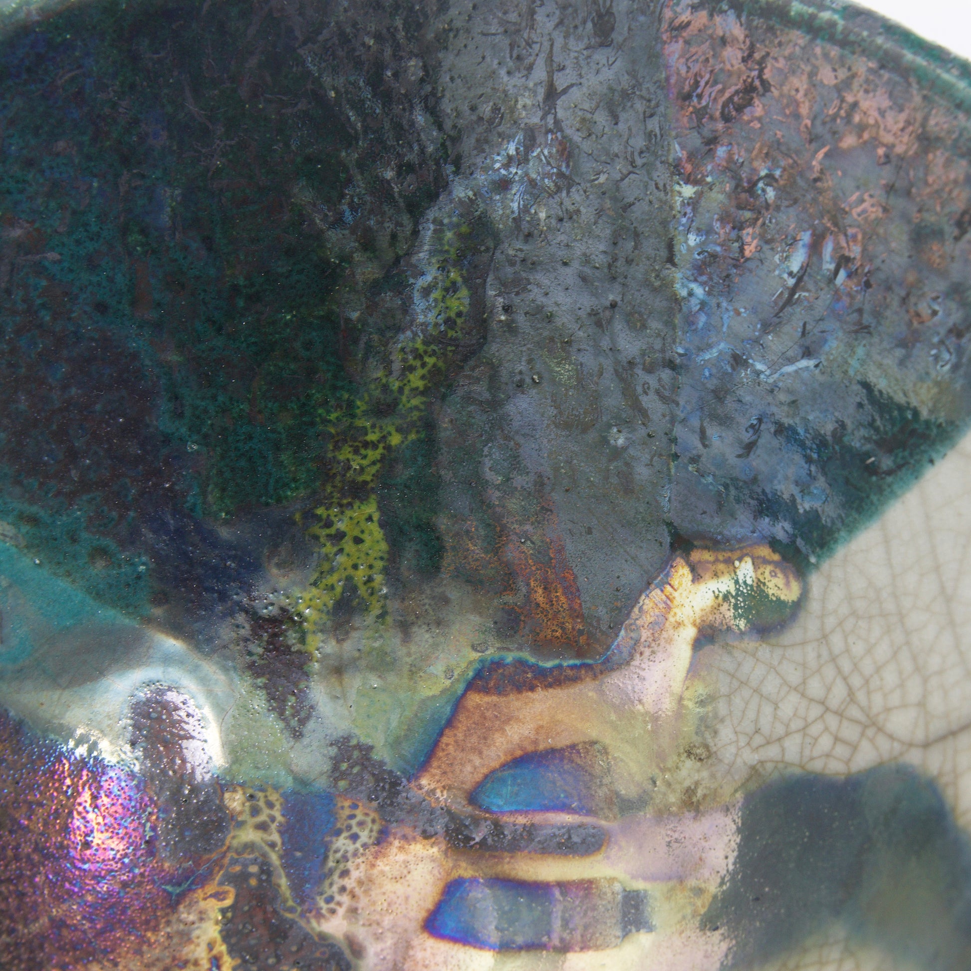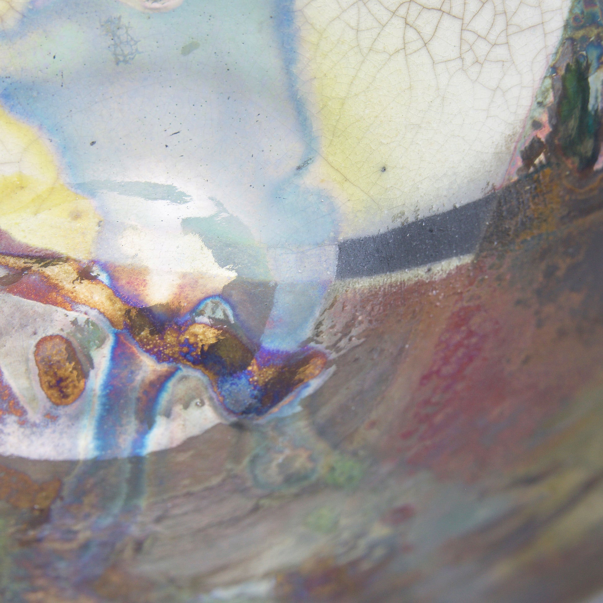 The rapid cooling of the Raku technique makes the final color result variable and may differ from the images.