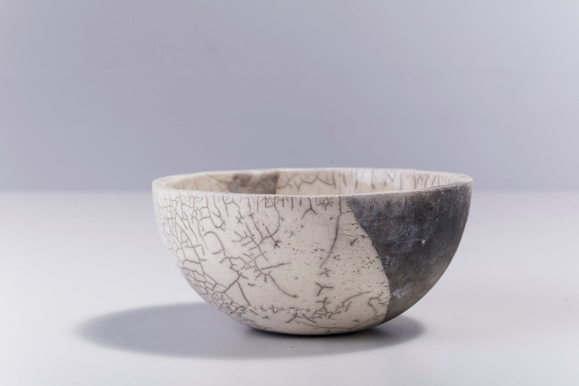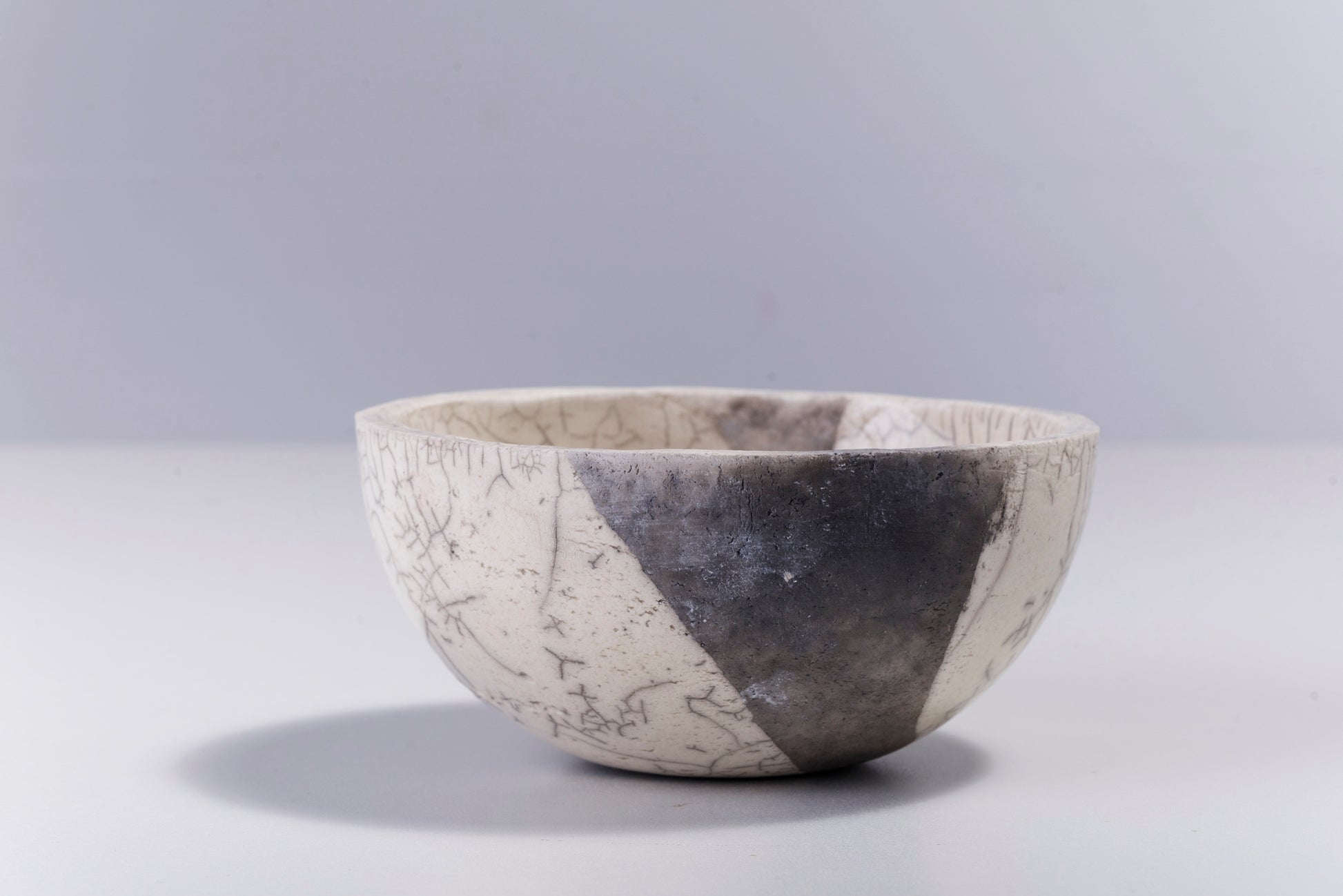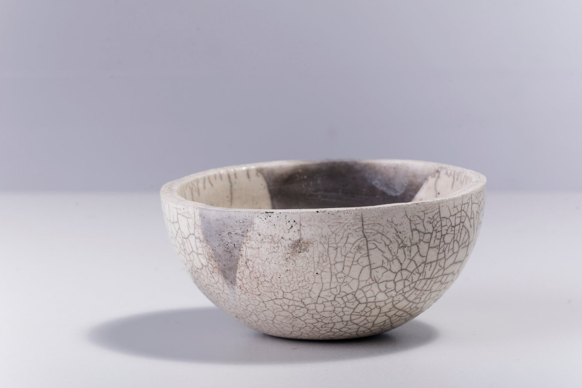 Irregular, dramatic gray cracks of bold visual impact embellish the polished ceramic surface of this spectacular chawan bowl, handcrafted following the ancient Japanese technique of Raku. A perfect complement to any decor, it is a one-of-a-kind objet d'art whose apparent imperfections are the result of unique craftsmanship.