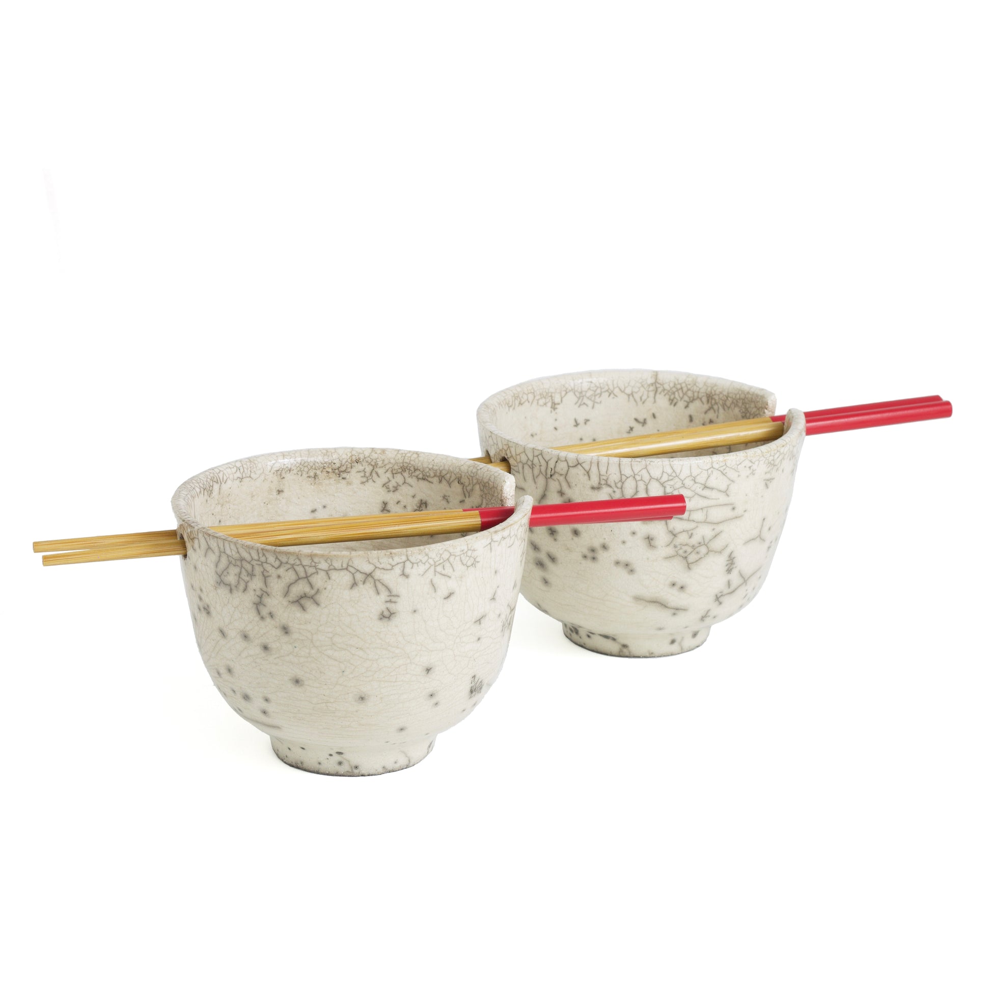 Japanese Ramen Bowls Raku Ceramic White Crackle Set of 2