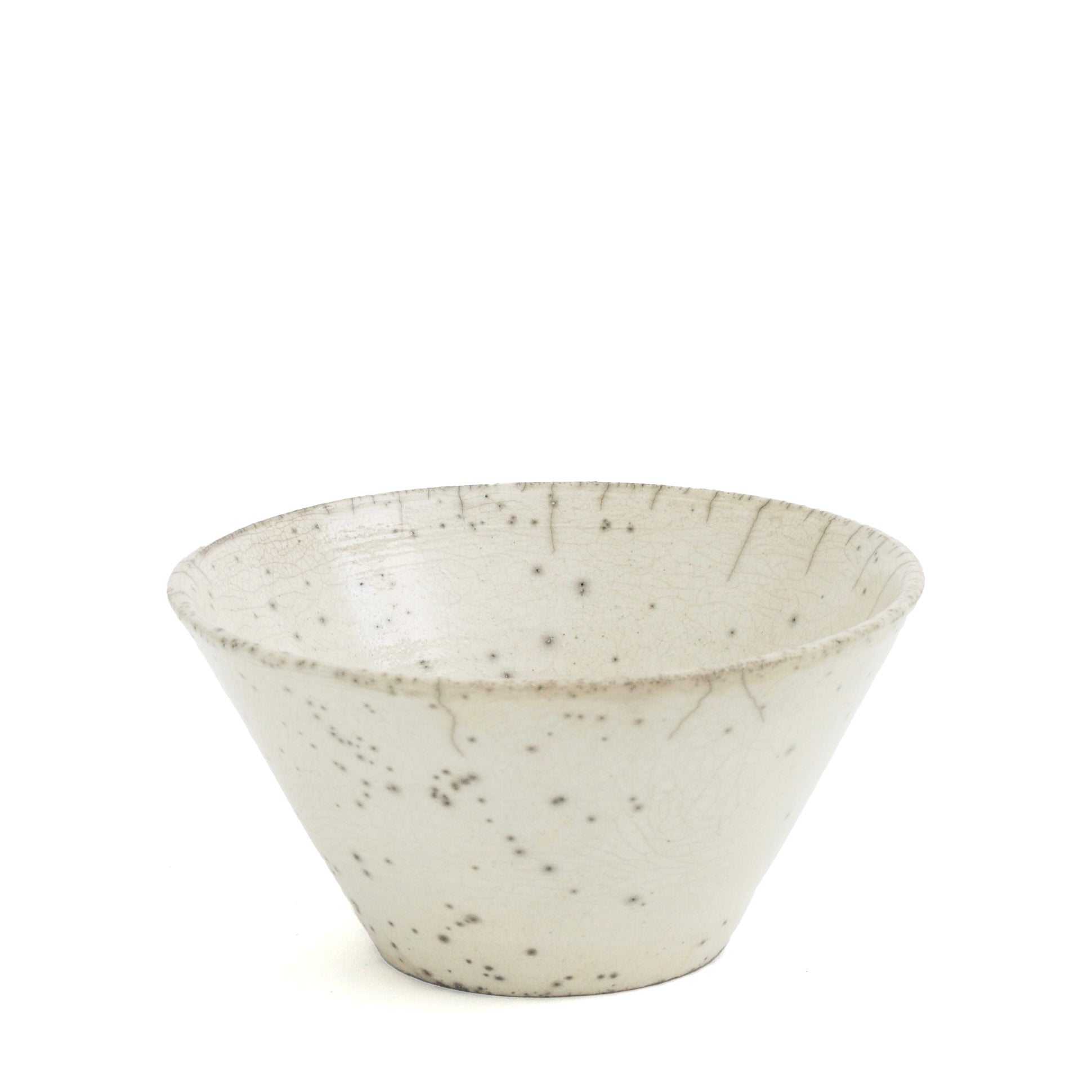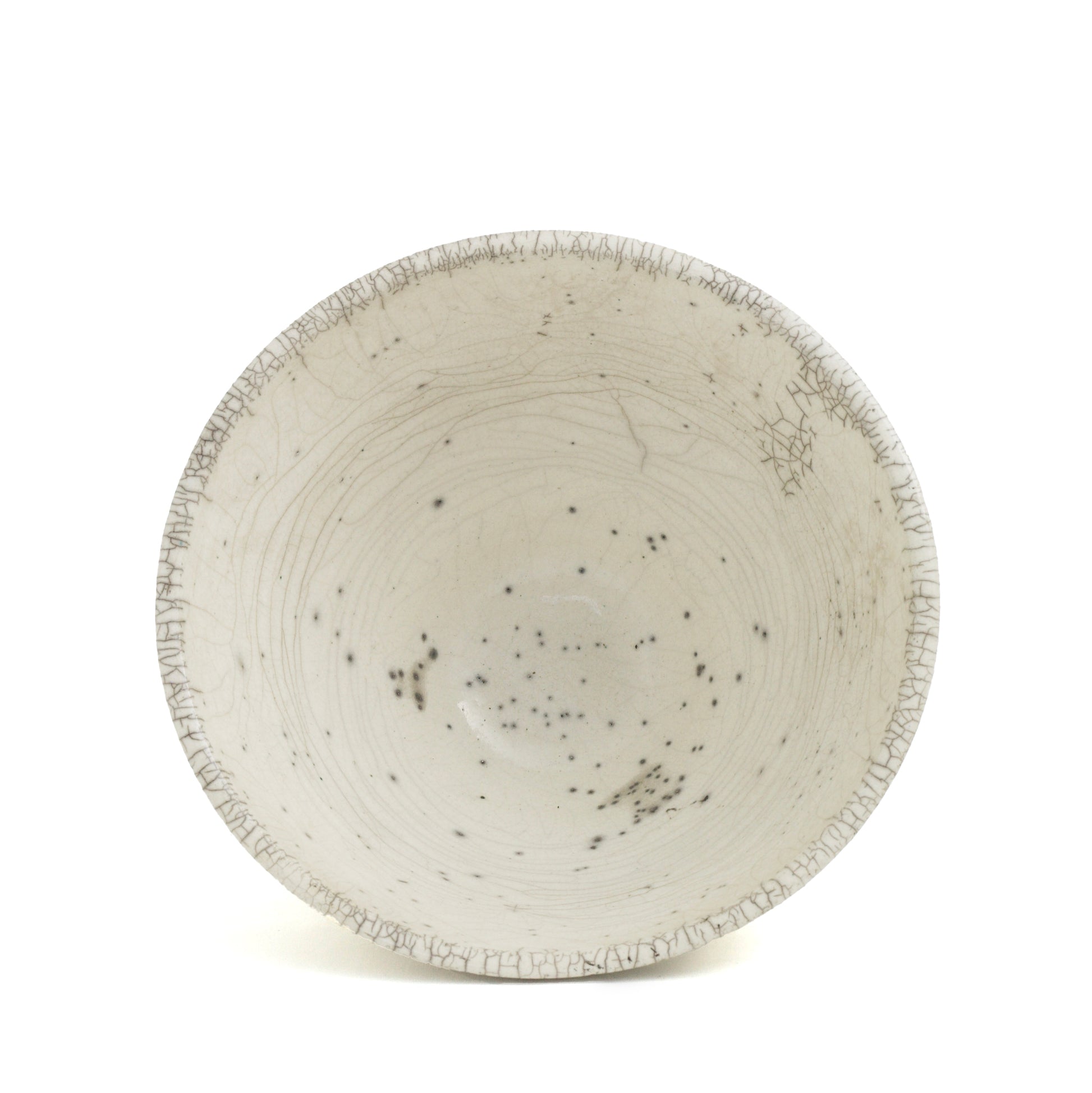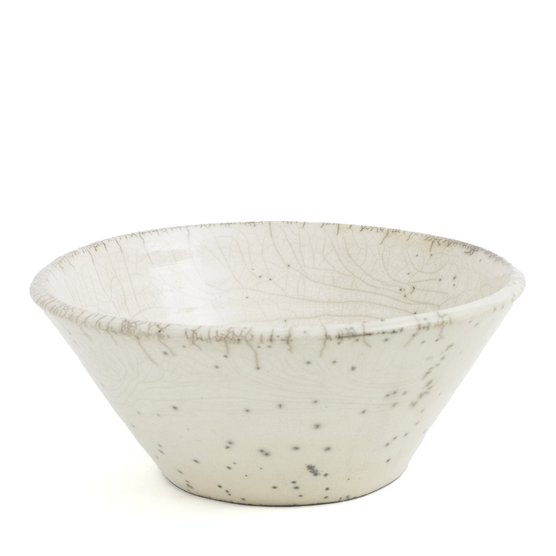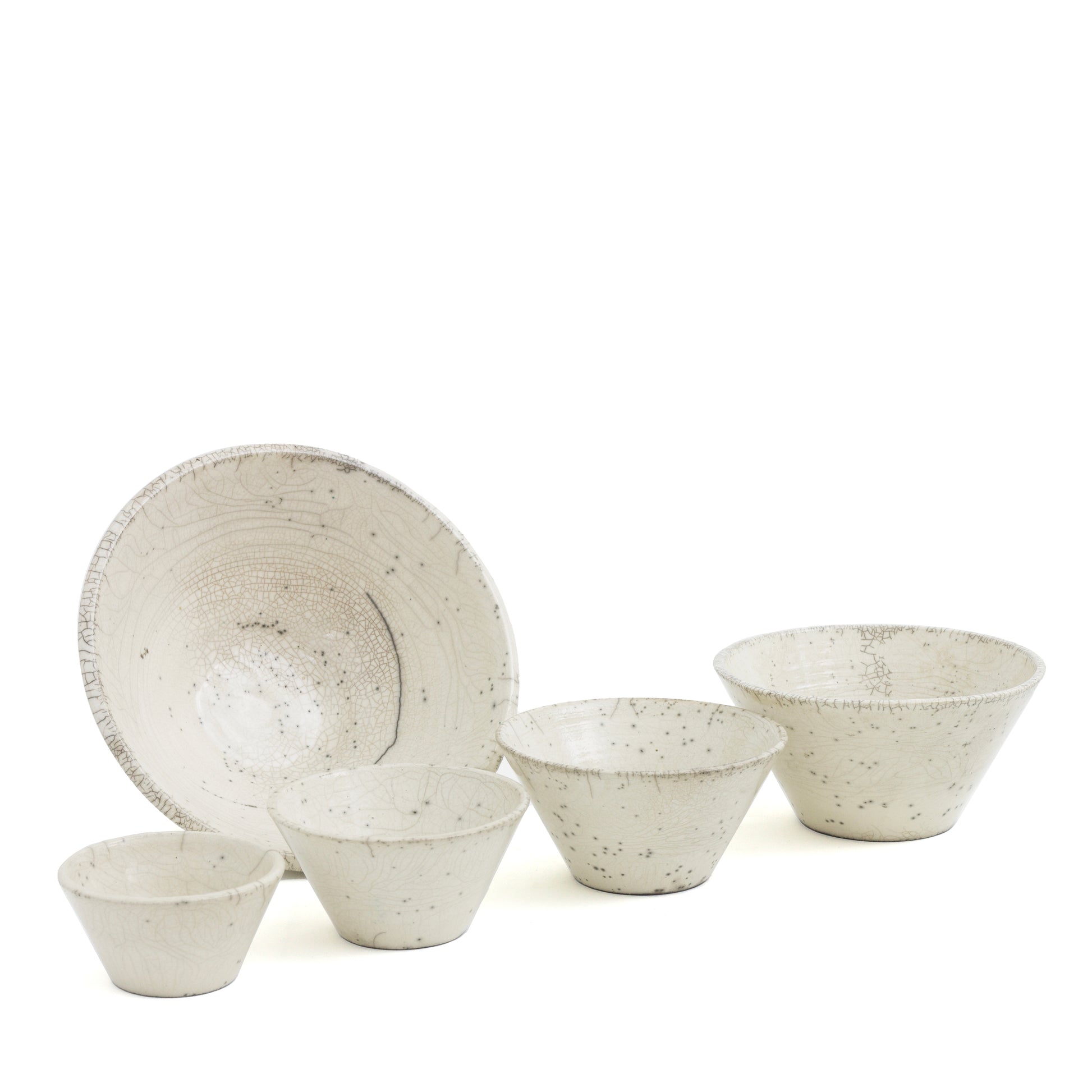 Handcrafted of white ceramic following the ancient Japanese technique of Raku to create an elegant crackled effect, this set of five bowls will set a distinctive tone to modern tableware collections. Tiny speckles adorn the pieces, lending them a fresh and lively personality.
