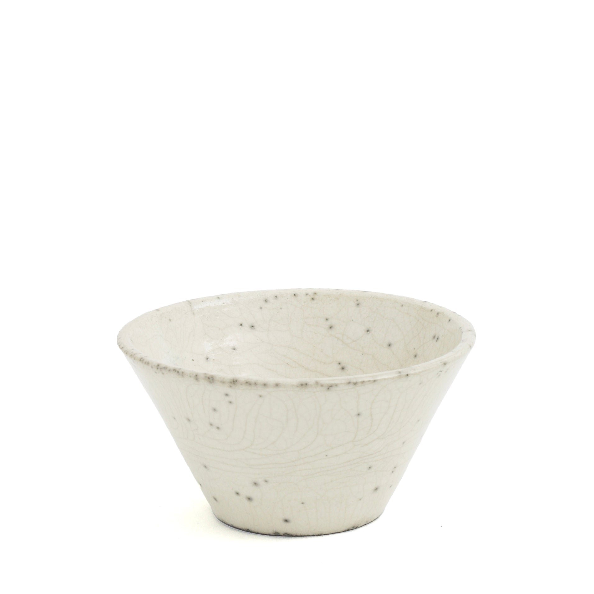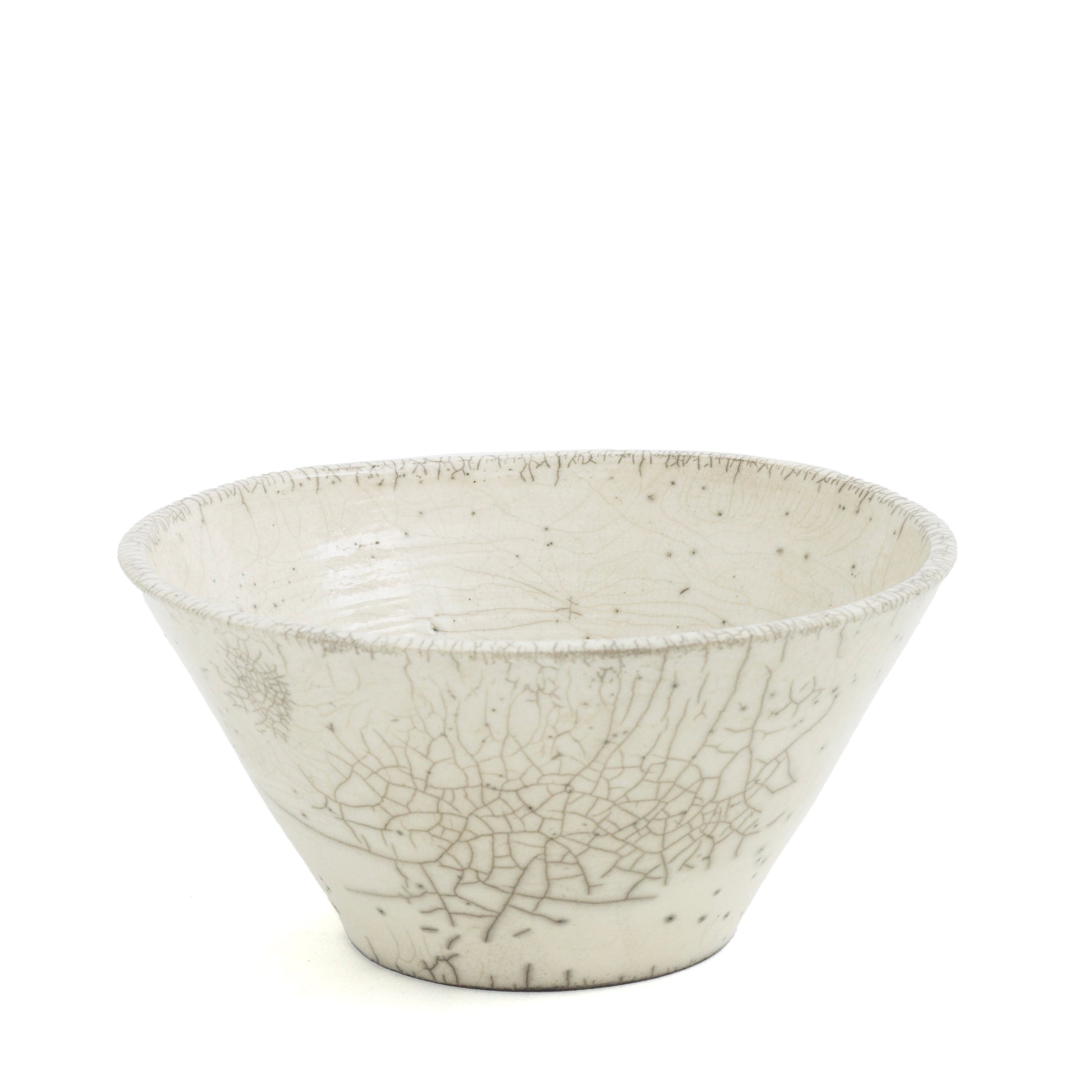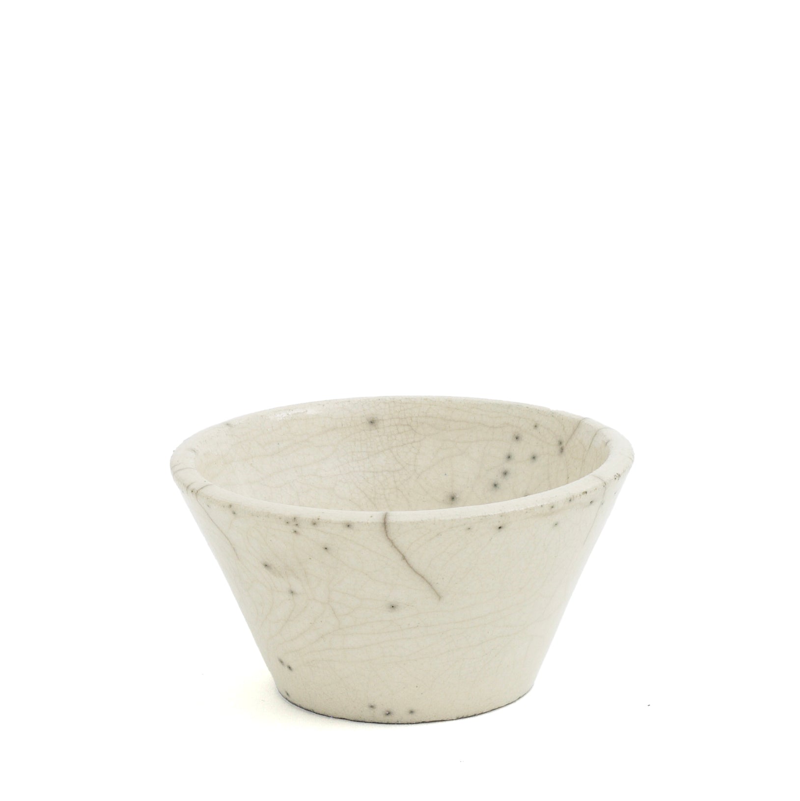 Handcrafted of white ceramic following the ancient Japanese technique of Raku to create an elegant crackled effect, this set of five bowls will set a distinctive tone to modern tableware collections. Tiny speckles adorn the pieces, lending them a fresh and lively personality.