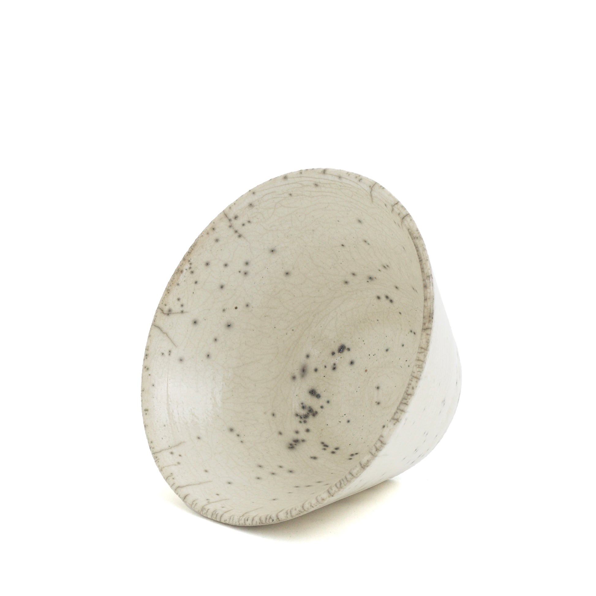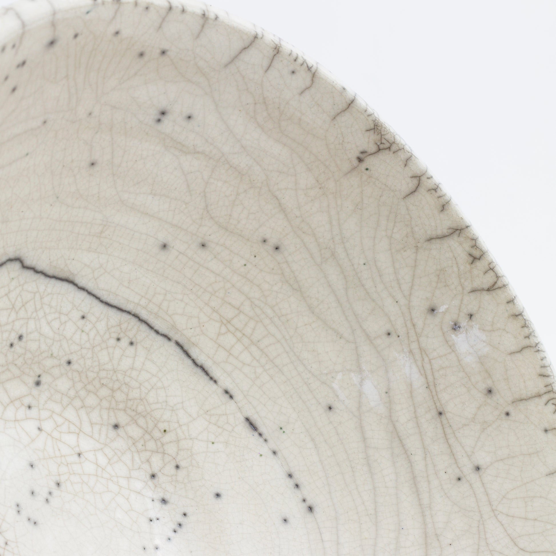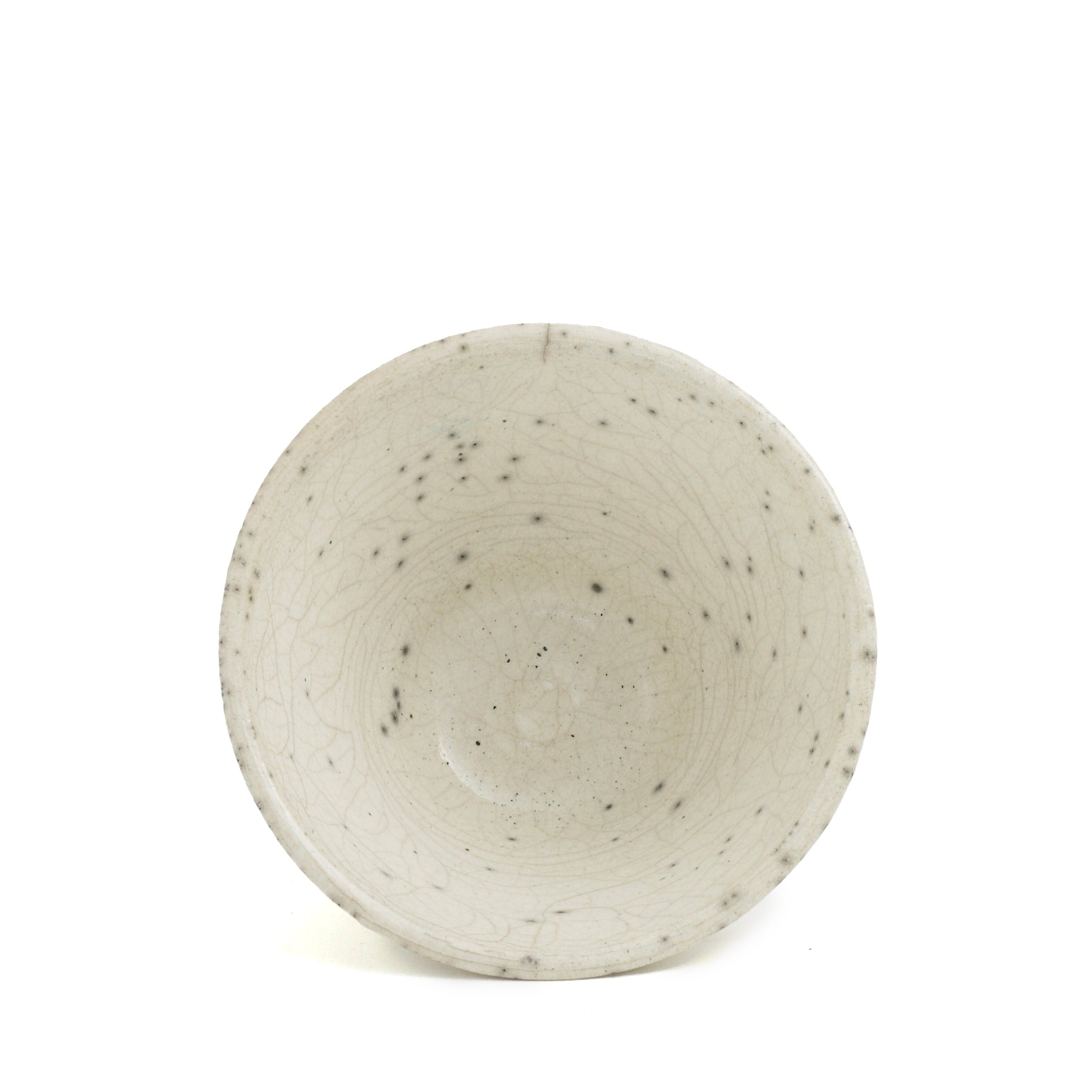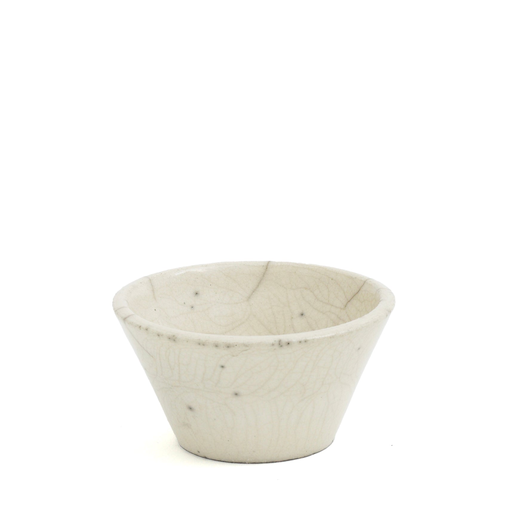Handcrafted of white ceramic following the ancient Japanese technique of Raku to create an elegant crackled effect, this set of five bowls will set a distinctive tone to modern tableware collections. Tiny speckles adorn the pieces, lending them a fresh and lively personality.