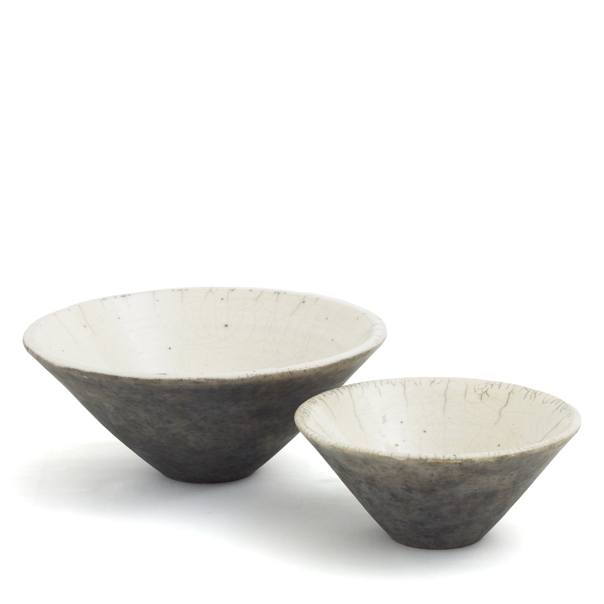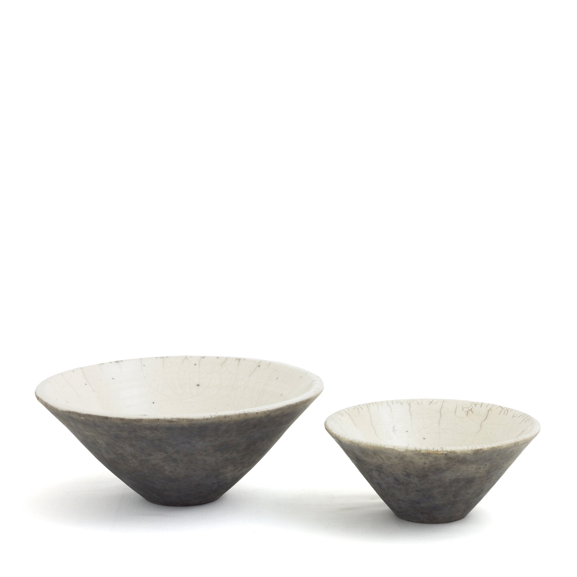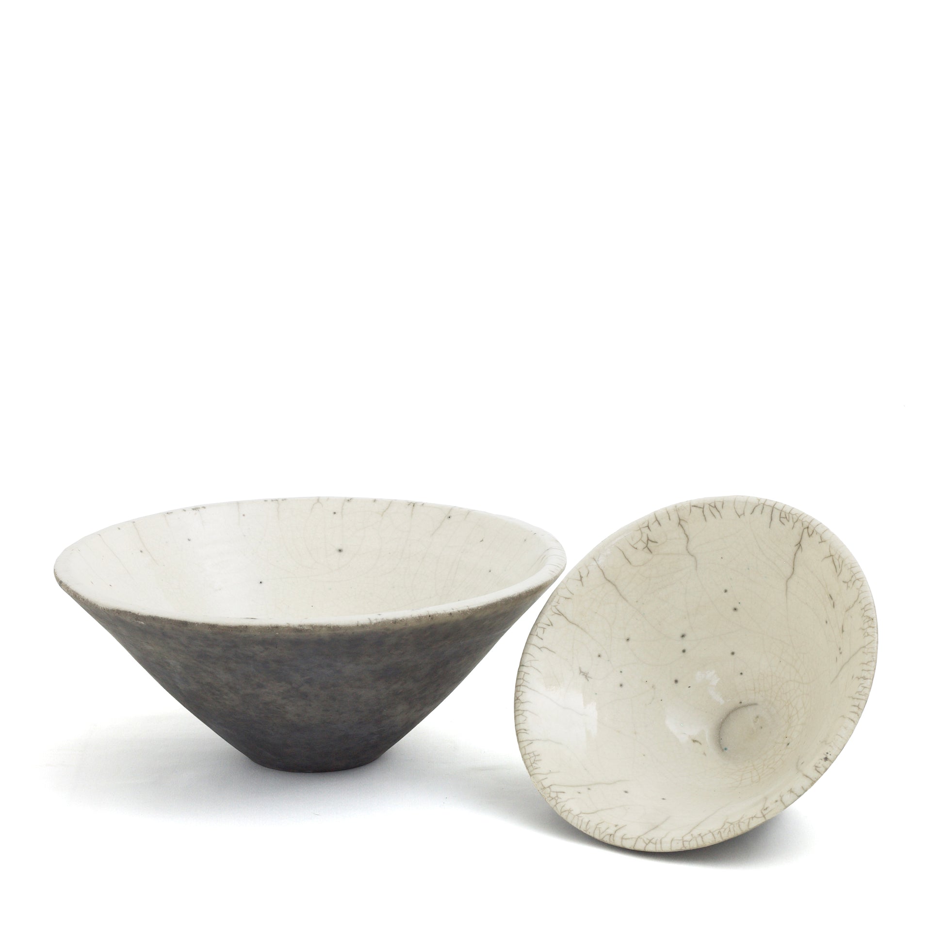 This one-of-a-kind set of two ceramic bowls is a showcase of pottery craftsmanship in impeccable Japanese style. Result of the ancient Raku technique, the dynamic crackled effect gracing the pieces gets combined with an intensely mottled design on the exterior, which contrasts with the luminous whiteness on the inside. The artisan crafting process captures the singularity of every piece.