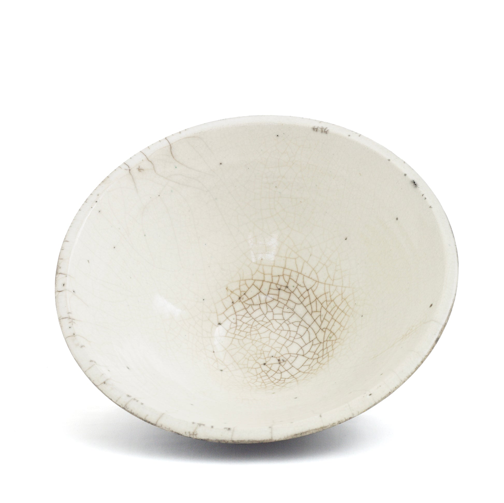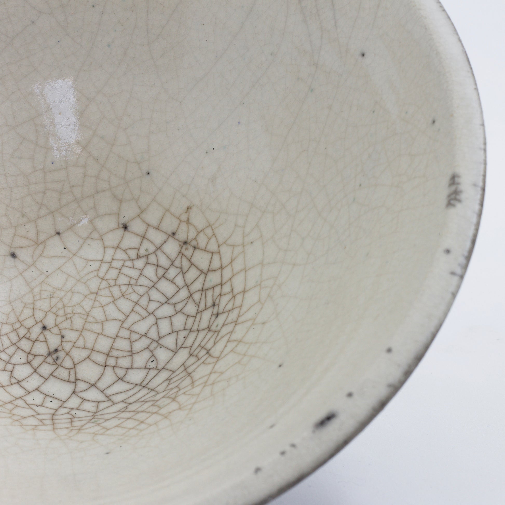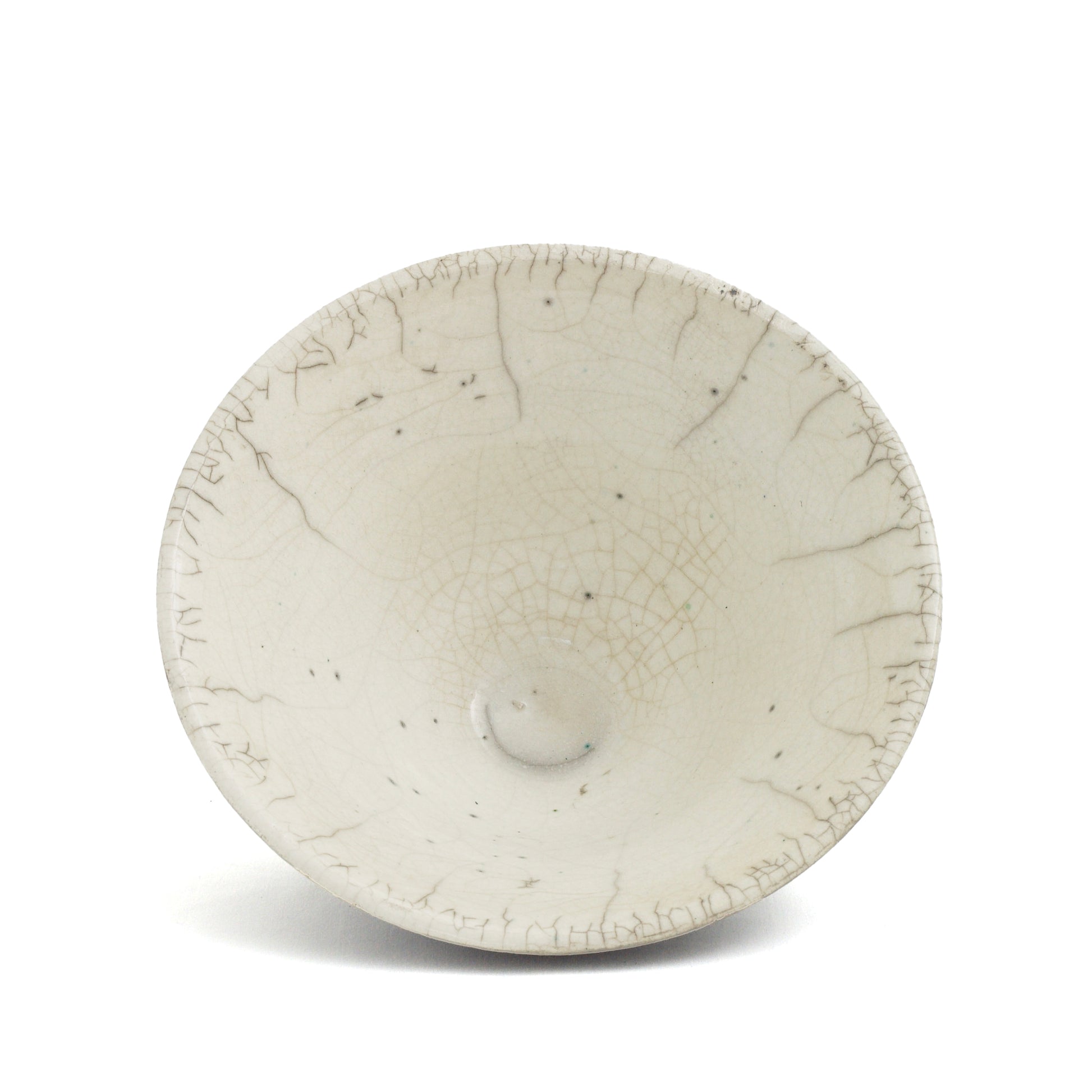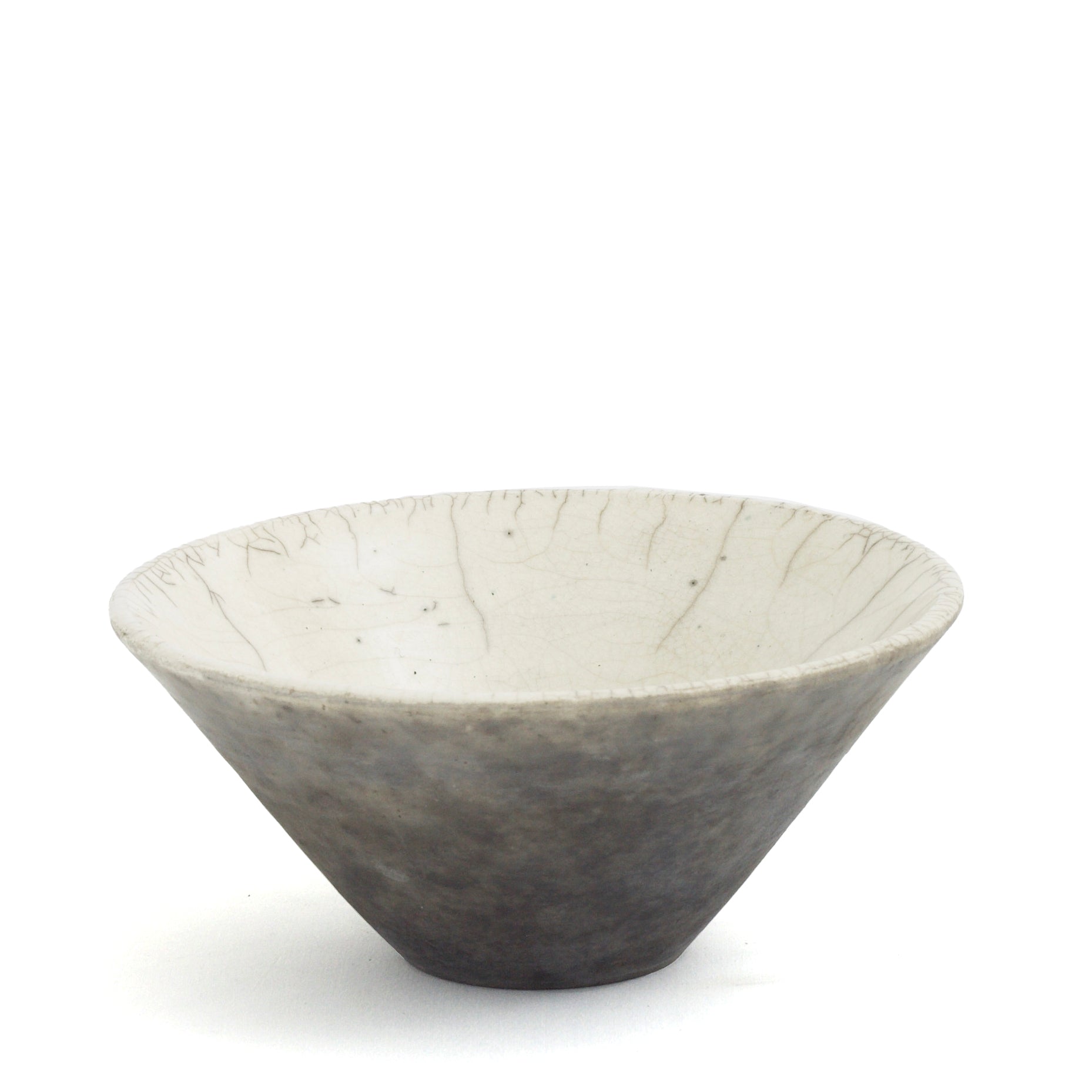 This one-of-a-kind set of two ceramic bowls is a showcase of pottery craftsmanship in impeccable Japanese style. Result of the ancient Raku technique, the dynamic crackled effect gracing the pieces gets combined with an intensely mottled design on the exterior, which contrasts with the luminous whiteness on the inside. The artisan crafting process captures the singularity of every piece.